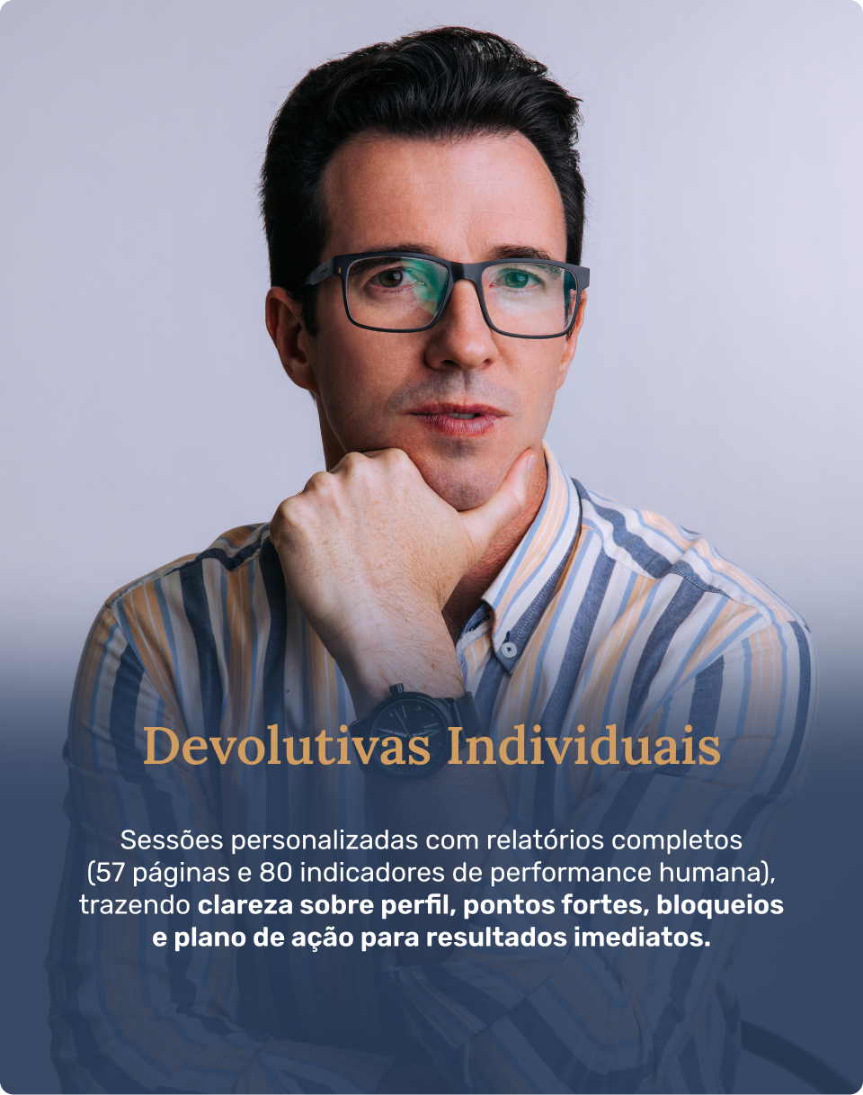 Já conduzi mais de 500 devolutivas individuais, 18 imersões presenciais e inúmeros treinamentos corporativos em diferentes estados do Brasil.
